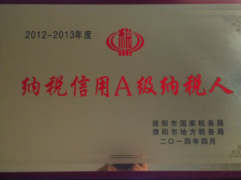 2014年4月,濮陽市國稅局、地稅局對“2012-2013年度納稅信用等級A級納稅人”進行了認定,公司成功獲得“納稅信用等級A級納稅人”這一榮譽稱號。